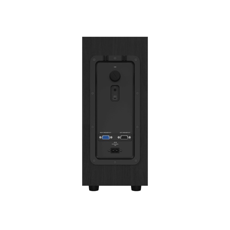 Toàn bộ hệ thống được hoàn thiện với lớp vân gỗ cao cấp, tạo cảm giác ấm áp nhưng vẫn giữ được vẻ sang trọng trên nền màu đen tinh tế. Các loa vệ tinh được thiết kế bo tròn mềm mại, đặt trên chân đế nghiêng giúp tối ưu hướng âm, đồng thời giữ bố cục gọn gàng, phù hợp với mọi bàn làm việc. Trong khi đó, loa subwoofer có kiểu dáng vuông vức chắc chắn, dễ dàng bố trí dưới bàn mà không chiếm nhiều diện tích, tạo nên tổng thể vừa đẹp mắt vừa thực dụng.