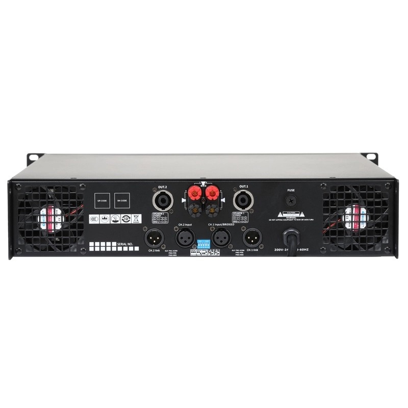 Mặt sau chiếc amply này được trang bị đầy đủ các cổng kết nối và quạt gió đa chiều, hỗ trợ tối ưu trong quá trình hoạt động.