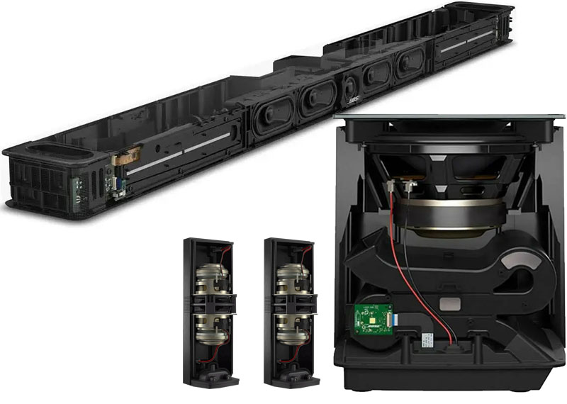 Chất lượng âm thanh đỉnh cao của Bose Premium được tạo nên từ hệ thống củ loa cao cấp, với thiết kế tối ưu để đảm bảo hiệu suất âm thanh ở mức cao nhất. Soundbar 900 được trang bị hệ thống củ loa phức tạp, bao gồm một tweeter ở trung tâm, bốn woofer được bố trí hai bên để tái tạo âm thanh trung thực và chi tiết. Đặc biệt, hai củ loa hướng trần ở mặt trên của loa giúp tăng cường hiệu ứng âm thanh ba chiều, đảm bảo âm thanh được lan tỏa khắp không gian.