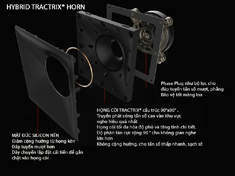 Thiết kế buồng thoát hơi cho loa Treble nhằm triệt tiêu hoàn toàn sóng đứng và các cộng hưởng tiêu cực trong quá trình loa Treble vận hành giúp âm thanh tần số cao được tái tạo chính xác và trung thực.