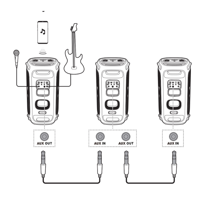 Với loa JBL được kết nối với thiết bị Bluetooth của bạn, sẽ bắt đầu bằng cổng AUX OUT, sau đó lại cắm vào cổng AUX IN bên loa tương tự, nếu bạn muốn kết nối thêm 1 loa thứ 3 sẽ lại bắt đầu từ công AUX OUT bên loa thứ 2 nối với cổng AUX IN bên loa thứ 3 (như hình) cữ vậy bạn có thể kết nối với sô lượng loa sẽ là không giới hạn giúp bạn thỏa sức mở rộng sân khẩu âm thanh yêu thích.