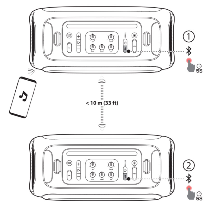 Với các mẫu: Loa JBL PartyBox 110, Loa JBL Partybox 310, Loa JBL PartyBox 710 Nhấn True Wireless Stereo (TWS) trên cả hai loa, đến khi đèn cả 2 loa báo hiệu cùng nhấp nháy, theo mặc định, loa được kết nối với thiết bị Bluetooth của bạn hoạt động như loa chính (kênh bên trái), trong khi loa còn lại đóng vai trò loa phụ (kênh bên phải).