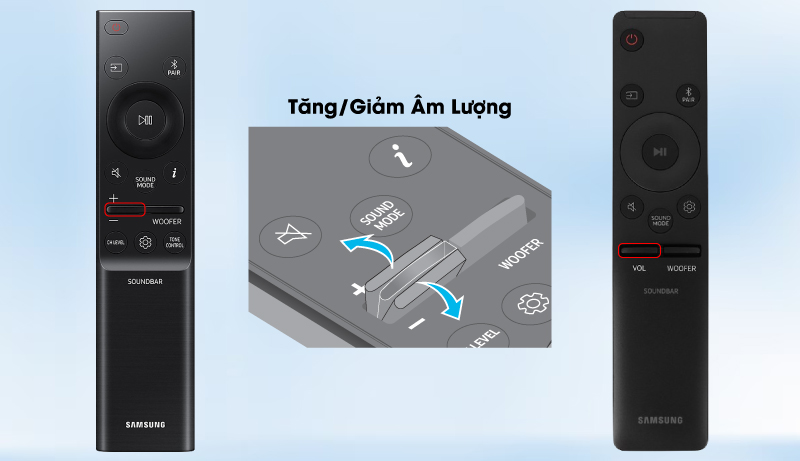 Để sử dụng tính năng này trên loa soundbar Samsung, nhấn nút "Tone Control" hoặc nút "Sound Control" tùy theo từng dòng soundbar.