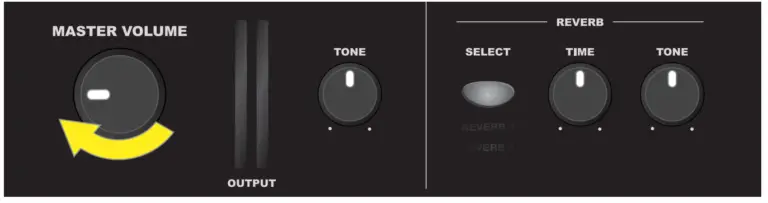 Xoay núm ÂM LƯỢNG CHÍNH và tất cả các nút ÂM LƯỢNG kênh cũng như nút REVERB hoàn toàn ngược chiều kim đồng hồ để bắt đầu cài đặt.