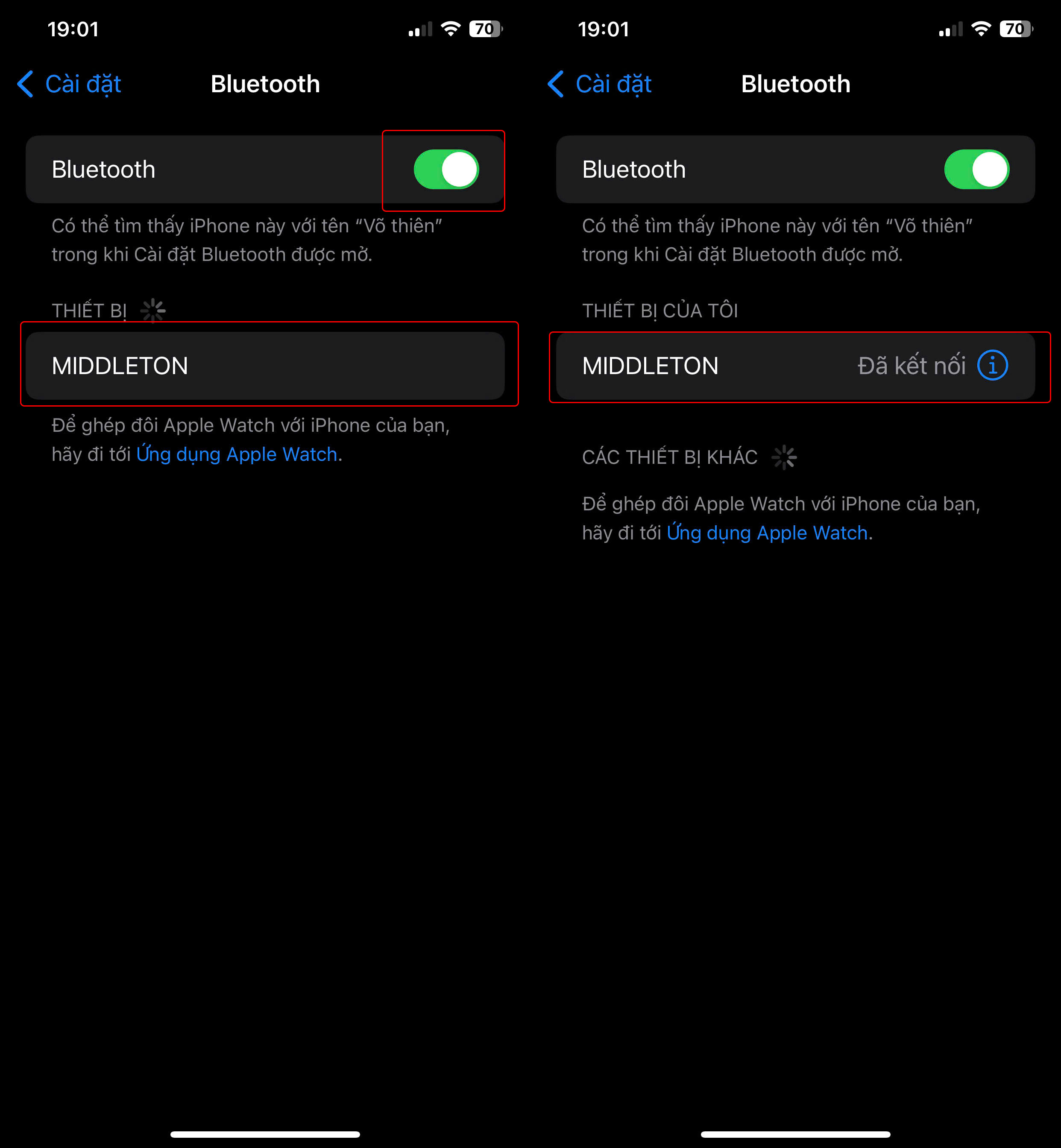 Vào phần Cài đặt → Bluetooth → Tìm kiếm và chọn Middleton từ danh sách các thiết bị có sẵn.