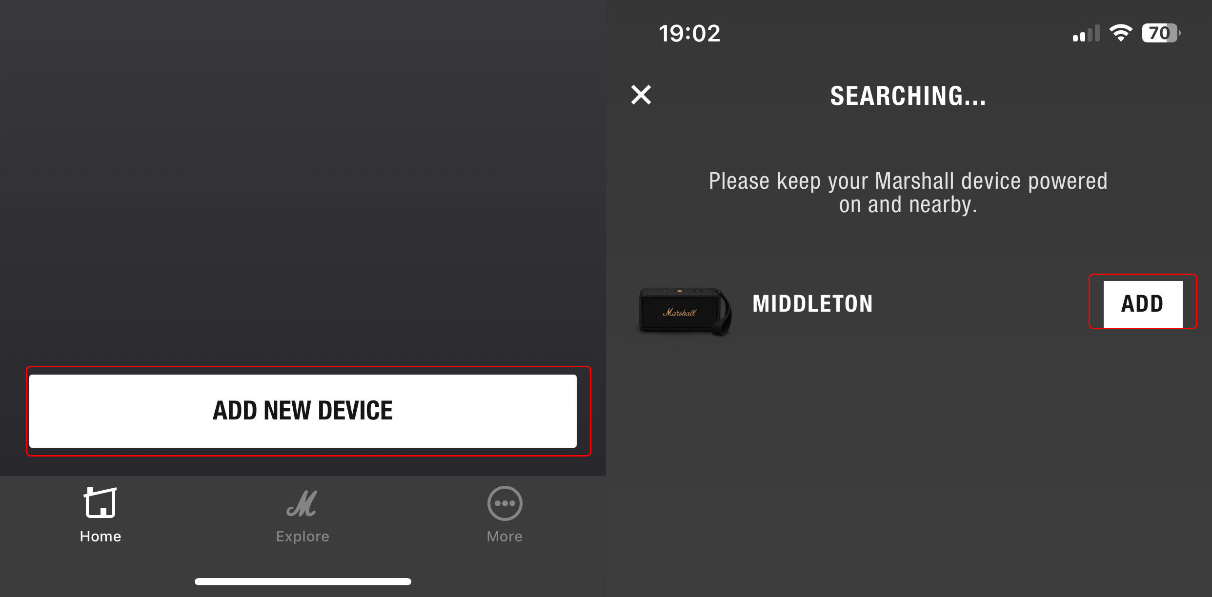 Nhấn chọn ADD NEWDEVICE, Đợi khi tên Middleton xuất hiện trên ứng dụng, chọn ADD để bắt đầu kết nối. Sau khi kết nối thành công, bạn có thể sử dụng ứng dụng để điều chỉnh các thông số âm thanh và điều khiển từ xa.