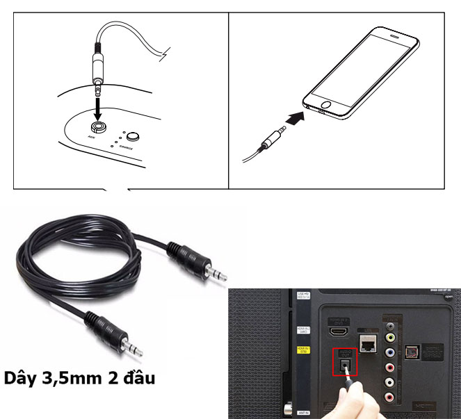 Cổng AUX: Sử dụng cáp âm thanh 3.5mm để kết nối thiết bị phát không có Bluetooth. Cắm một đầu dây vào cổng AUX trên loa và đầu còn lại vào thiết bị phát nhạc.