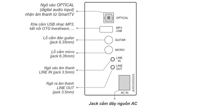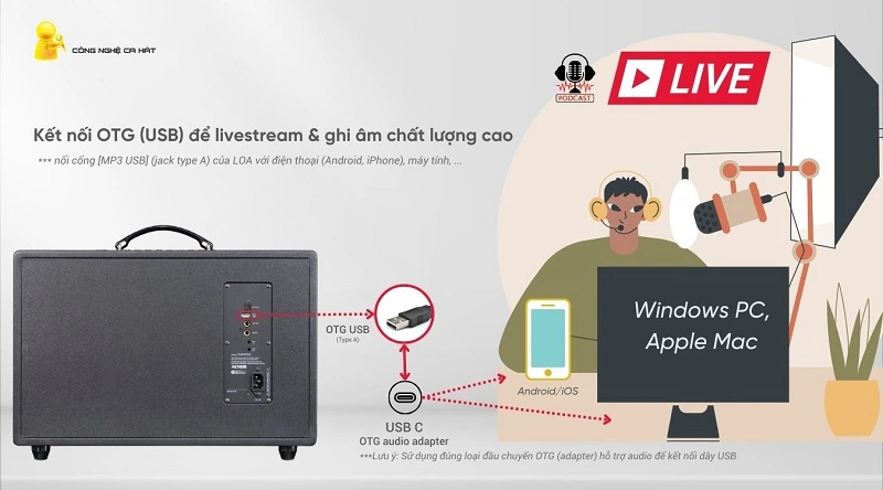 Loa còn hỗ trợ kết nối Smart TV qua cổng Optical, mang lại trải nghiệm karaoke tại gia chất lượng cao. Tính năng livestream và ghi âm thông qua cáp USB/OTG cho chất lượng âm thanh chuẩn phòng thu.