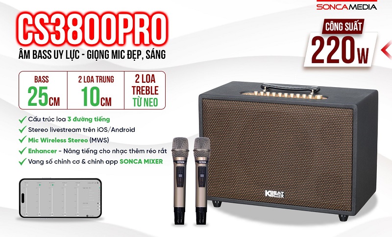 Bộ micro đi kèm được thiết kế tối ưu cho loa CS3800 Pro, cho âm thanh trong trẻo, bắt tiếng nhạy, chống hú tốt, giúp giọng hát mượt mà và đầy nội lực.