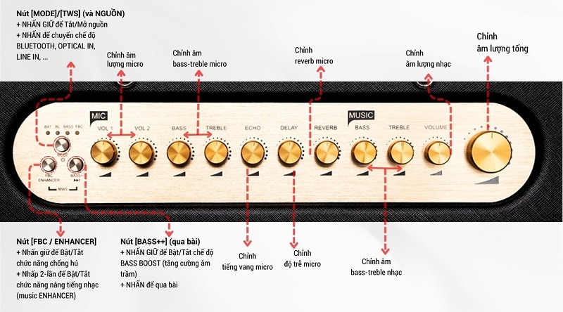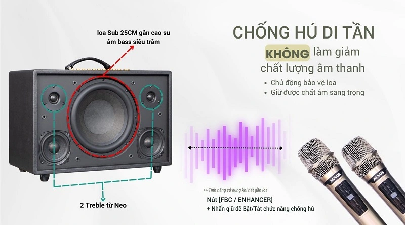 Công nghệ chống hú di tần loại bỏ tiếng rít khó chịu từ micro, bảo vệ loa và giữ chất âm tự nhiên, kết hợp tính năng Enhancer giúp âm nhạc to và sống động hơn.