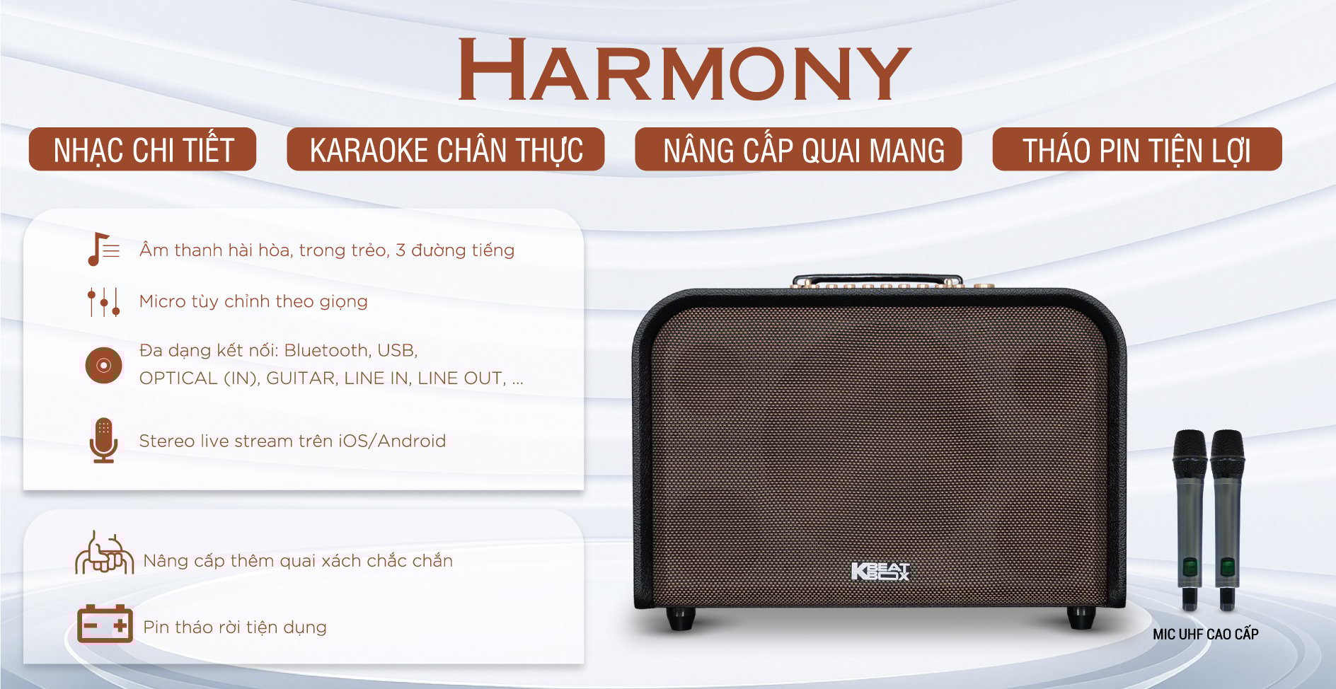 Loa được trang bị quai xách chắc chắn với chất liệu nâng cấp, giúp di chuyển dễ dàng. Kích thước gọn gàng phù hợp cho picnic, dã ngoại hay tiệc ngoài trời. Điểm đặc biệt là pin tháo rời, vừa kéo dài tuổi thọ khi sử dụng nguồn điện trực tiếp, vừa an toàn khi mang lên máy bay. Người dùng có thể dễ dàng thay hoặc tháo pin khi cần, biến HARMONY thành thiết bị âm thanh di động hoàn hảo cho mọi chuyến đi.