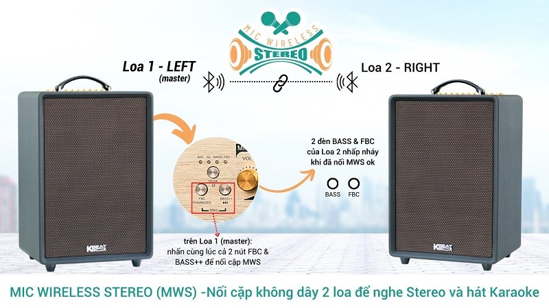 Với công nghệ MIC WIRELESS STEREO (MWS), Acnos High Fidelity cung cấp một trải nghiệm âm thanh stereo không dây đầy ấn tượng. Bạn có thể kết nối hai loa Acnos để tạo thành một hệ thống âm thanh hoàn chỉnh. Một loa sẽ đảm nhiệm vai trò loa chính (Master), xử lý tín hiệu âm thanh từ thiết bị nguồn và chia thành hai kênh trái – phải. Kênh trái sẽ được truyền qua kết nối không dây đến loa phụ, giúp đồng bộ hoàn toàn các hiệu ứng âm thanh như Echo, Reverb, Delay giữa hai loa.