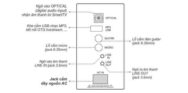 Loa karaoke Acnos High Fidelity hỗ trợ nhiều cổng kết nối tiện lợi, giúp người dùng dễ dàng kết nối với các thiết bị khác nhau. Các cổng AC, OPTICAL IN, MP3 USB, LINE IN/OUT, MIC và GUITAR giúp loa có thể kết nối với tivi, điện thoại, máy tính bảng, thiết bị phát nhạc hoặc nhạc cụ, đáp ứng tốt nhu cầu nghe nhạc, hát karaoke hay biểu diễn âm nhạc.