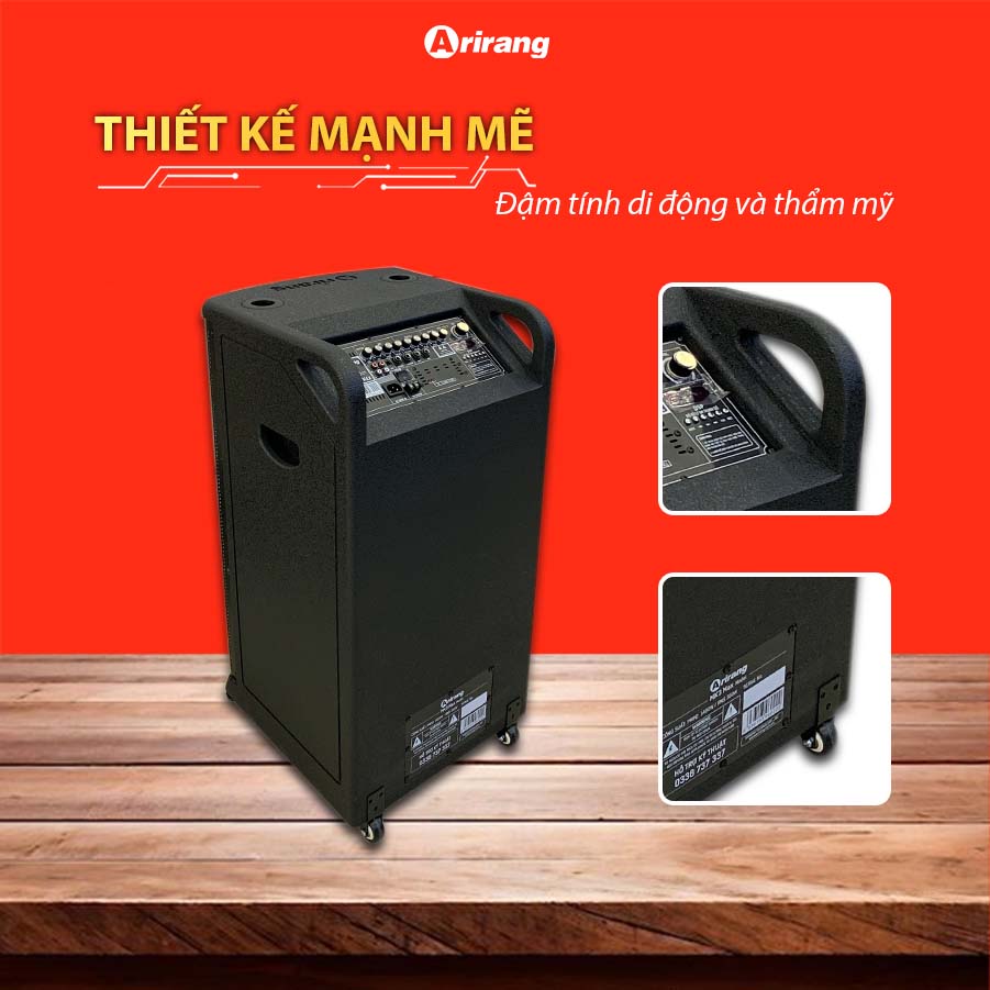 Loa Arirang MK6 Max sở hữu thiết kế mang phong cách hiện đại, mạnh mẽ và cực kỳ tiện dụng. Toàn bộ thân loa được phủ lớp sơn đen sang trọng, chắc chắn, dễ dàng phù hợp với mọi không gian từ trong nhà đến ngoài trời. Điểm đặc biệt là loa được tích hợp tay kéo và hệ thống bánh xe linh hoạt, giúp bạn di chuyển dễ dàng trong mọi tình huống. Mặt trước loa được bảo vệ bởi lưới ê căng kim loại phủ sơn tĩnh điện, có khả năng chống va đập, chống oxy hóa, bảo vệ hệ thống củ loa bên trong luôn an toàn và bền bỉ theo thời gian.