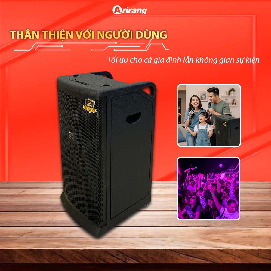 Arirang MK6 Max được trang bị hệ thống ba loa ba đường tiếng gồm bass 40cm, trung 14cm và treble 6cm. Đây là cấu hình lý tưởng để tái tạo âm thanh chi tiết, sắc nét và sống động trên toàn dải tần số. Loa bass cho âm trầm sâu và chắc, loa trung xử lý giọng hát rõ ràng, trong khi loa treble sử dụng nam châm Neodymium cao cấp để mang lại âm cao sáng rõ, không chói gắt. Với hệ thống này, MK6 Max có thể đáp ứng tốt cả nhu cầu nghe nhạc, trình diễn sân khấu nhỏ lẫn karaoke gia đình mà vẫn giữ được sự cân bằng và lan tỏa âm thanh rộng rãi trong không gian.