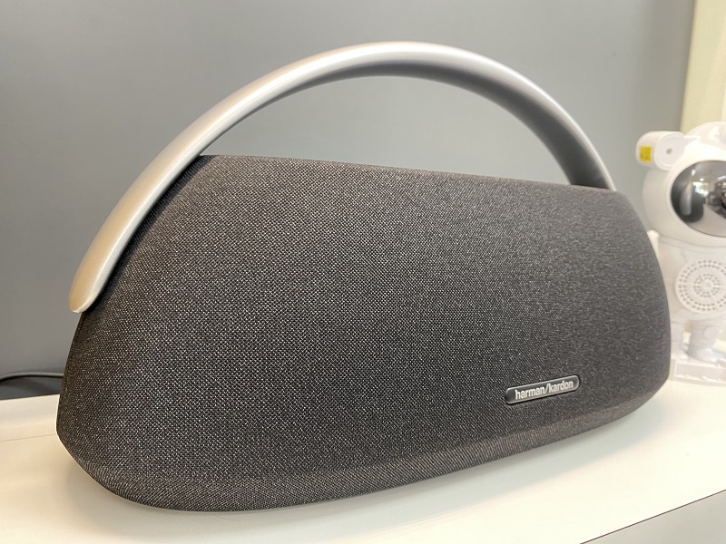 Loa Harman Kardon Go + Play 3 vẫn giữ nguyên hình dáng elip quen thuộc, nhưng thiết kế của nó có những phá cách và sử dụng các vật liệu cao cấp hơn so với phiên bản trước. Toàn bộ phần thân loa được bao phủ bởi lớp ê-căng làm từ vải Kavdrat chống bụi và chống cháy.