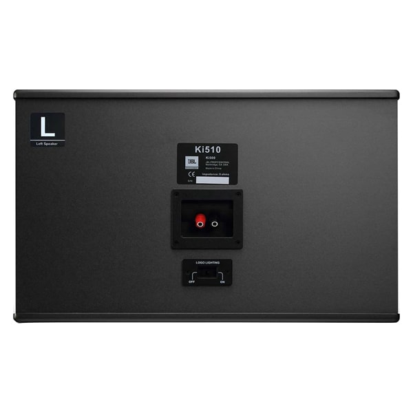 Phía sau của loa nhìn từ trái sang phải thì loa có chữ L là loa trái, loa còn lại là loa R tức là loa phải lưu ý cần đặt đúng theo vị trí thiết kế của hãng. Tiếp đó là chiếc tem có ghi model KI510 là thông số kỹ thuật cơ bản của loa., bên dưới 2 cầu để kết nối với dây loa được phân biệt màu rõ ràng. Tiếp đến là chế độ phát nhạc của loa đối với từng phòng karaoke sao cho độ phóng của âm thanh là phù hợp nhất.