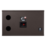 Mặt sau của loa cũng được thiết kế và bao bọc bằng tấm gỗ màu cafe trông khá đẹp và cũng là nơi bố trí, kết nối với các hệ thống âm thanh cùng với các thông tin về sản phẩm.