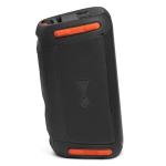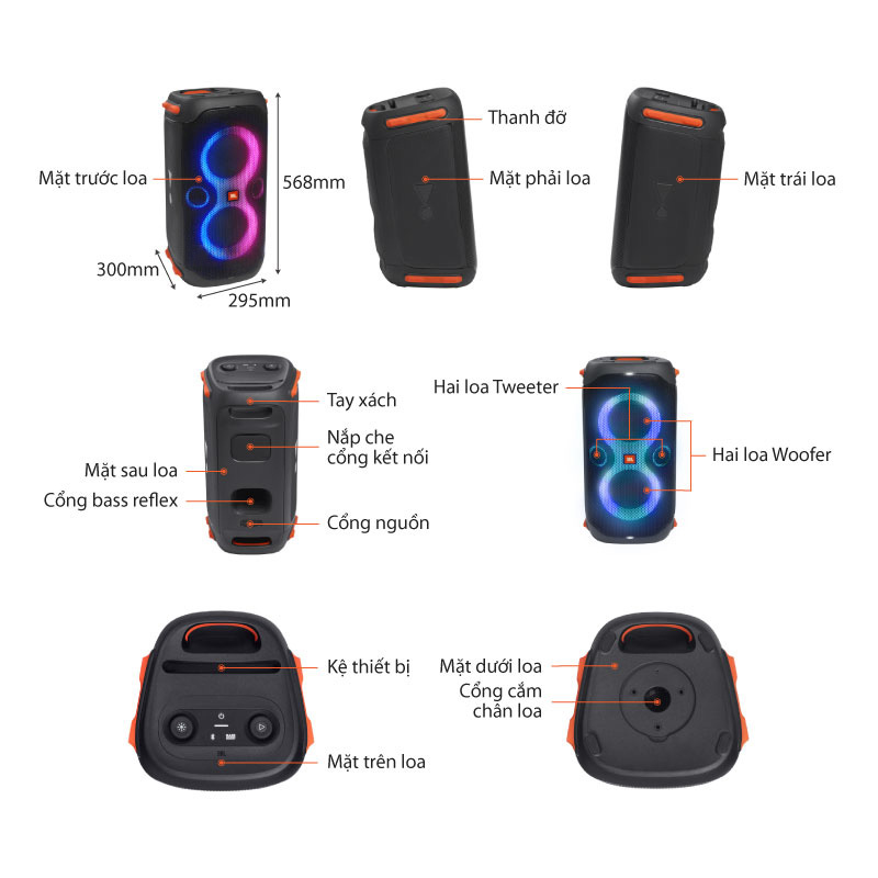 Ngoài ra có một điểm nhấn trong thiết kế rất đáng chú ý chính là hệ thống 4 thanh đỡ cao su màu cam nổi bật ở 2 bên loa. Nó giúp người dùng có thể đặt loa dọc hoặc ngang tùy thích khá tiện lợi. Và ở trung tâm của các mặt bên của loa là logo chấm than JBL cực kỳ đẹp mắt, nó giúp mọi người nhận diện thương hiệu chiếc loa của bạn một cách dễ dàng.