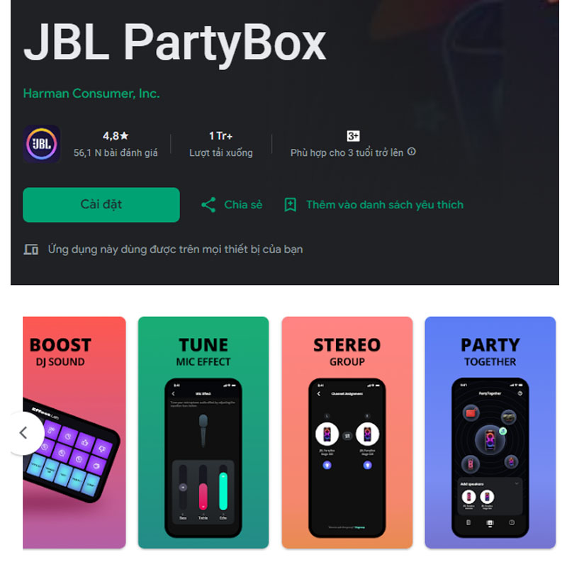 JBL cũng cung cấp ứng dụng JBL Partybox trên cả iOS và Android, cho phép người dùng dễ dàng điều khiển các chế độ phát nhạc, điều chỉnh âm lượng, thay đổi chế độ ánh sáng và thêm các hiệu ứng âm thanh chỉ với một vài thao tác trên điện thoại. Giao diện ứng dụng đơn giản, dễ sử dụng, mang đến trải nghiệm liền mạch và thuận tiện.