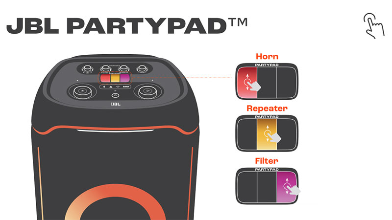 JBL PartyPad™ nằm ở mặt trên của loa, chỉ với vài thao tác đơn giản gồm chạm, giữ và trượt để bạn hóa thân thành DJ chuyên nghiệp. Tạo không khí bữa tiệc của riêng mình bằng các hiệu ứng tương tác thú vị của JBL PartyPad ngay trên bảng ở mặt trên của PartyBox Ultimate và phối lại các hiệu ứng âm thanh chất lượng như DJ chuyên nghiệp.
