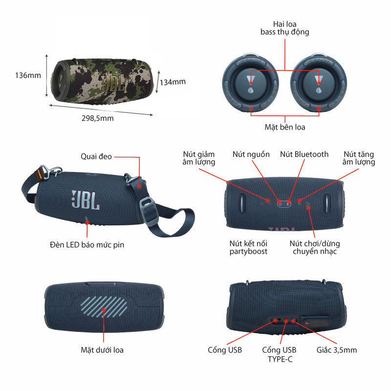 JBL Xtreme 3 có kích thước 29.85 x 13.59 x 13.41 cm và trọng lượng chỉ 1,95 kg, dễ dàng mang theo nhờ dây đeo vai tích hợp. Thiết kế này giúp loa không chỉ nhỏ gọn mà còn rất phong cách, với ba tùy chọn màu sắc: đen, xanh dương và xanh rằn ri, phù hợp với nhiều phong cách cá nhân.