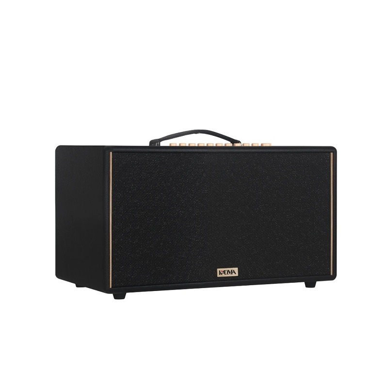 Loa karaoke Kadma KS68 sở hữu ngoại hình vuông vắn hiện đại nhưng vẫn giữ được sự mềm mại nhờ các đường bo cong tinh tế. Bề mặt hoàn thiện mịn, sạch và kín khít cho cảm giác cao cấp, sang trọng. Với kích thước 500 x 270 x 280mm cùng trọng lượng 13.5kg, loa khá gọn gàng và dễ dàng di chuyển, đặc biệt nhờ quai xách chắc chắn phía trên. Thùng loa làm từ gỗ MDF bền bỉ, bọc da PU chống thấm và kết hợp ê căng vải dệt cao cấp, vừa tăng tính thẩm mỹ vừa nâng cao độ bền trong quá trình sử dụng.