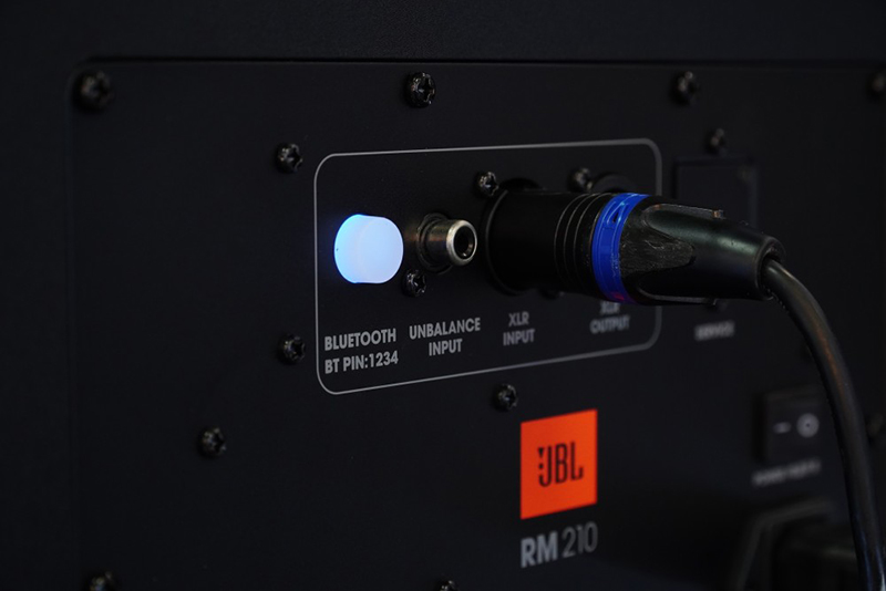 Mặt sau của JBL RM210 được trang bị một cặp đầu vào / đầu ra XLR, một cổng Unbalance, một công tắc Bluetooth, một cổng dịch vụ và một nút nguồn.