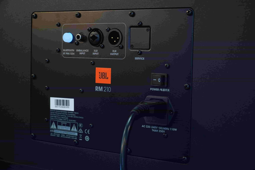 Mặt sau của JBL RM210 được trang bị một cặp đầu vào / đầu ra XLR, một cổng Unbalance, một công tắc Bluetooth, một cổng dịch vụ và một nút nguồn.