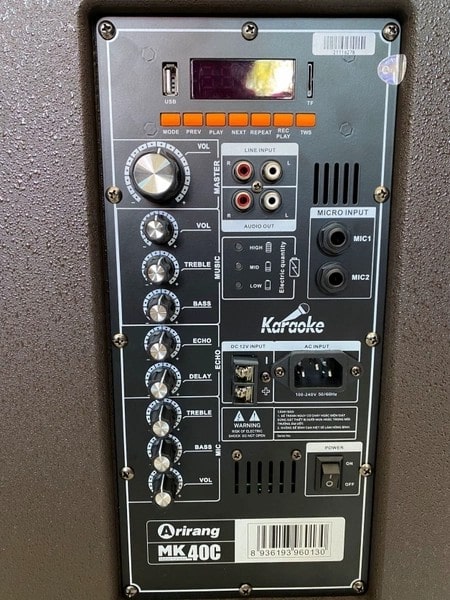 Bảng điều khiển của loa Arirang MK-40C được nhà sản xuất đặt ở phía sườn phải của loa, có các nút điều chỉnh các thông số của mic, loa như : Bass, treble, echo…