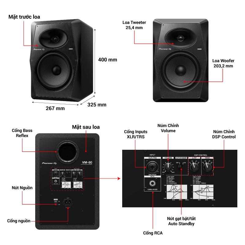 Loa Pioneer VM-80 sử dụng mạch khuếch đại Class D với DSP lấy mẫu 96 kHz, giúp tái tạo âm thanh băng thông rộng và chi tiết. Công suất tổng của loa đạt 120W, trong đó 90W dành cho bass và 30W cho tweeter, mang đến âm thanh mạnh mẽ và sắc nét trong dải tần số từ 34 Hz – 36 kHz. Nhờ công suất vượt trội, loa đáp ứng tốt cả nhu cầu giải trí lẫn sản xuất âm nhạc chuyên nghiệp.