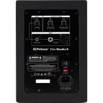 PreSonus Eris Studio 5 sở hữu ngoại hình hiện đại với tông màu đen chủ đạo, mang lại vẻ cứng cáp và chuyên nghiệp. Kích thước của loa được tính toán kỹ lưỡng, cao 291.5 mm, rộng 203.2 mm, sâu 223 mm cùng trọng lượng 5.2 kg – vừa đủ để đặt gọn gàng trong các không gian phòng thu cá nhân mà không gây cồng kềnh. Một điểm cộng lớn là thiết kế lỗ thoát hơi ở mặt trước, vừa cải thiện hiệu quả tái tạo âm bass, vừa giúp loa hoạt động tối ưu dù đặt gần tường hay trên bàn làm việc.