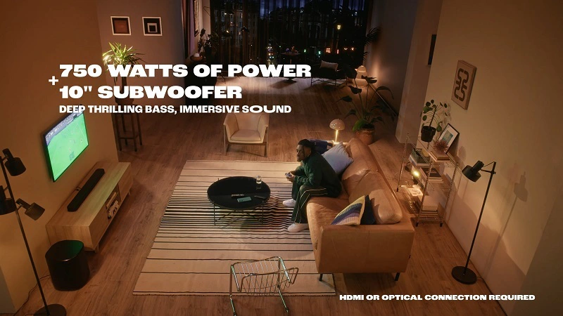 Với tổng công suất lên đến 750W, JBL Bar 500MK2 mang lại âm lượng mạnh mẽ, dải âm đầy uy lực nhưng vẫn giữ được sự chi tiết và cân bằng. Âm trầm được tái hiện sâu lắng nhờ loa subwoofer 10 inch không dây, tạo cảm giác như bạn đang ngồi ngay giữa một buổi hòa nhạc trực tiếp hoặc trong rạp phim chuyên nghiệp.