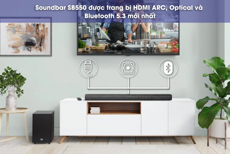 JBL Cinema SB550 không chỉ nổi bật về chất lượng âm thanh mà còn về tính tiện lợi trong kết nối. Loa được trang bị Bluetooth 5.3, phiên bản cao cấp nhất hiện nay, giúp bạn dễ dàng kết nối với điện thoại, máy tính bảng, hay laptop. Công nghệ này cũng giúp mở rộng phạm vi kết nối và đảm bảo tín hiệu âm thanh không bị gián đoạn.