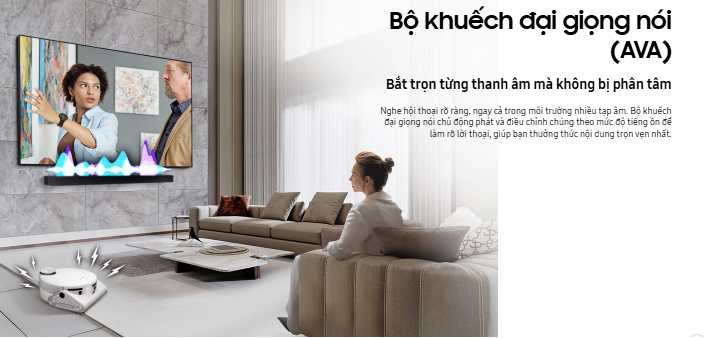 Công nghệ Adaptive Sound tối ưu âm thanh theo từng nội dung, đảm bảo lời thoại rõ ràng và âm thanh chi tiết. Bộ khuếch đại giọng nói AVA tự động tăng âm lượng hội thoại khi môi trường có tiếng ồn, giúp bạn không bỏ lỡ bất kỳ lời nói nào.