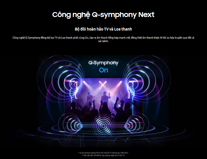 Q-Symphony cho phép loa thanh và loa TV phát đồng thời, tạo ra âm thanh mạnh mẽ và đồng nhất. Công nghệ AI tối ưu âm thanh qua tất cả các kênh, mang lại trải nghiệm nghe bùng nổ, lý tưởng cho phim ảnh, thể thao và âm nhạc.