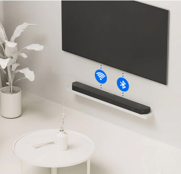 Chỉ cần One Remote Control, bạn có thể điều khiển toàn bộ hệ thống. Kết nối Wi-Fi hoặc Bluetooth với TV nhanh chóng, đồng bộ hoàn hảo âm thanh và hình ảnh.