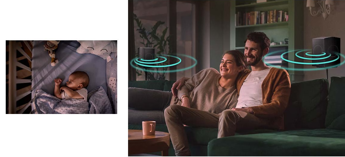 Bộ loa vệ tinh không dây kèm theo giúp âm thanh lan tỏa khắp phòng, kể cả từ trên cao. Mỗi hiệu ứng, lời thoại và âm nhạc đều trở nên sống động, chân thực như trong rạp phim.