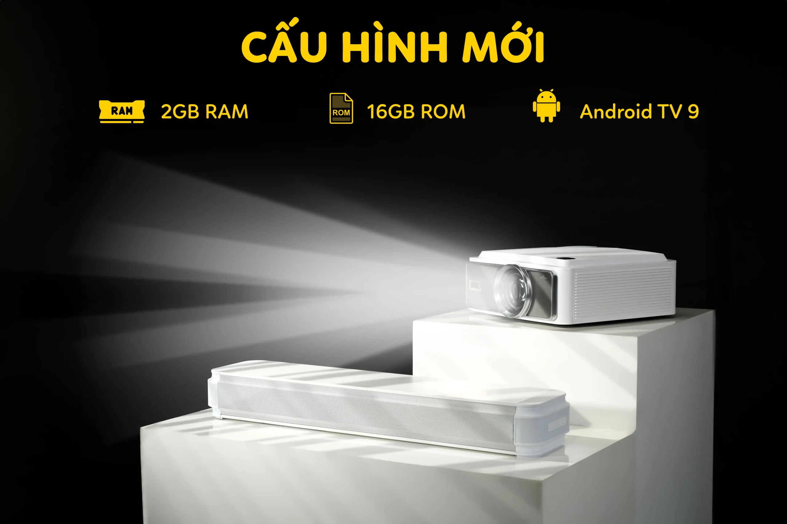 Cấu hình mới của Beecube STAR Pro cũng là một điểm nổi bật quan trọng, giúp máy chiếu này vượt trội so với các thế hệ trước. Với hệ điều hành Android TV 9, bộ nhớ RAM 2GB và ROM 16GB, máy chiếu hoạt động mượt mà hơn, đảm bảo khả năng chạy các ứng dụng giải trí, truyền hình trực tuyến và điều khiển thông minh một cách trơn tru. Cấu hình mạnh mẽ này tạo nên trải nghiệm sử dụng liền mạch, nhanh chóng đáp ứng mọi nhu cầu giải trí và làm việc hiện đại.