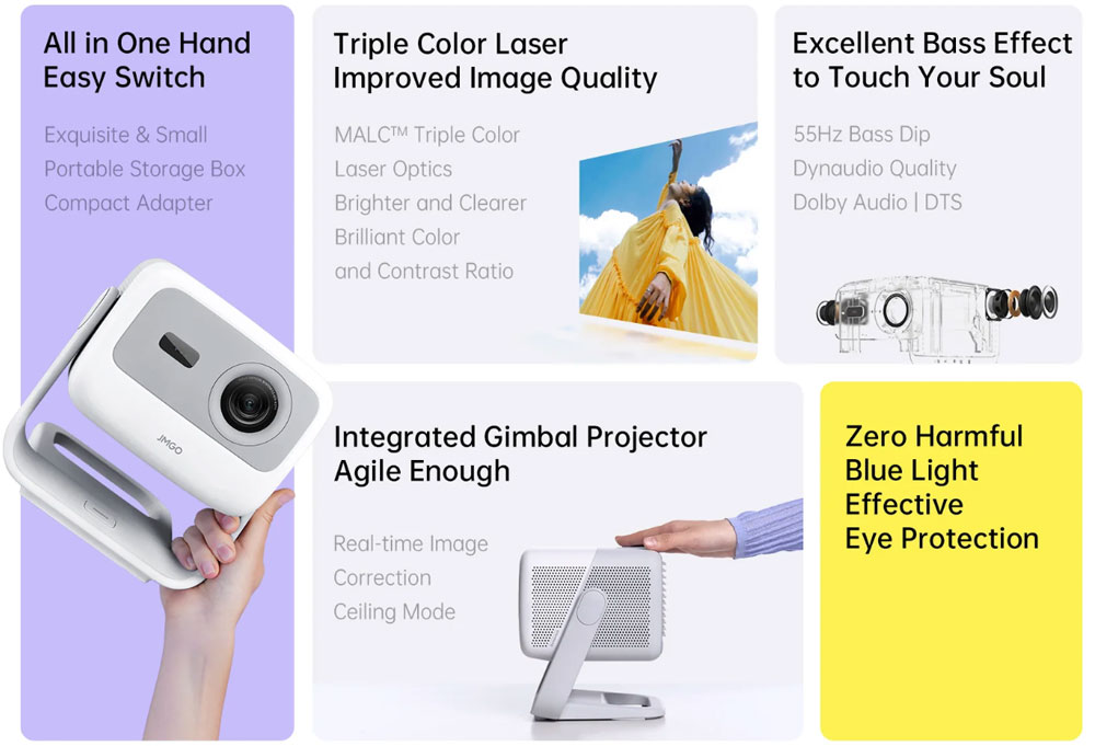 JMGO N1 có khả năng tự động lấy nét và tự chỉnh méo hình tức thì, rất hữu ích khi thay đổi vị trí đặt máy. Đi kèm là cảm biến bảo vệ mắt: khi phát hiện có người ở gần nguồn sáng, máy sẽ tạm dừng để tránh ánh sáng laser chiếu trực tiếp vào mắt, đảm bảo an toàn cho người sử dụng.