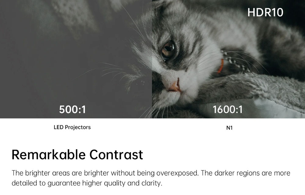 JMGO N1 sử dụng nguồn sáng Tri-Color Laser, công nghệ vốn xuất hiện trên những dòng máy chiếu cao cấp. Nhờ đó, màu sắc hiển thị cực kỳ chính xác, độ tương phản đạt 1600:1, độ sáng lên đến 750 ISO Lumens, đảm bảo hình ảnh Full HD 1080P luôn sắc nét dù trình chiếu vào ban ngày. Kích thước khung hình 60–200 inch cho cảm giác xem thoải mái, đắm chìm, thêm HDR10 giúp gia tăng độ sâu và độ chi tiết ở cả vùng sáng lẫn tối.