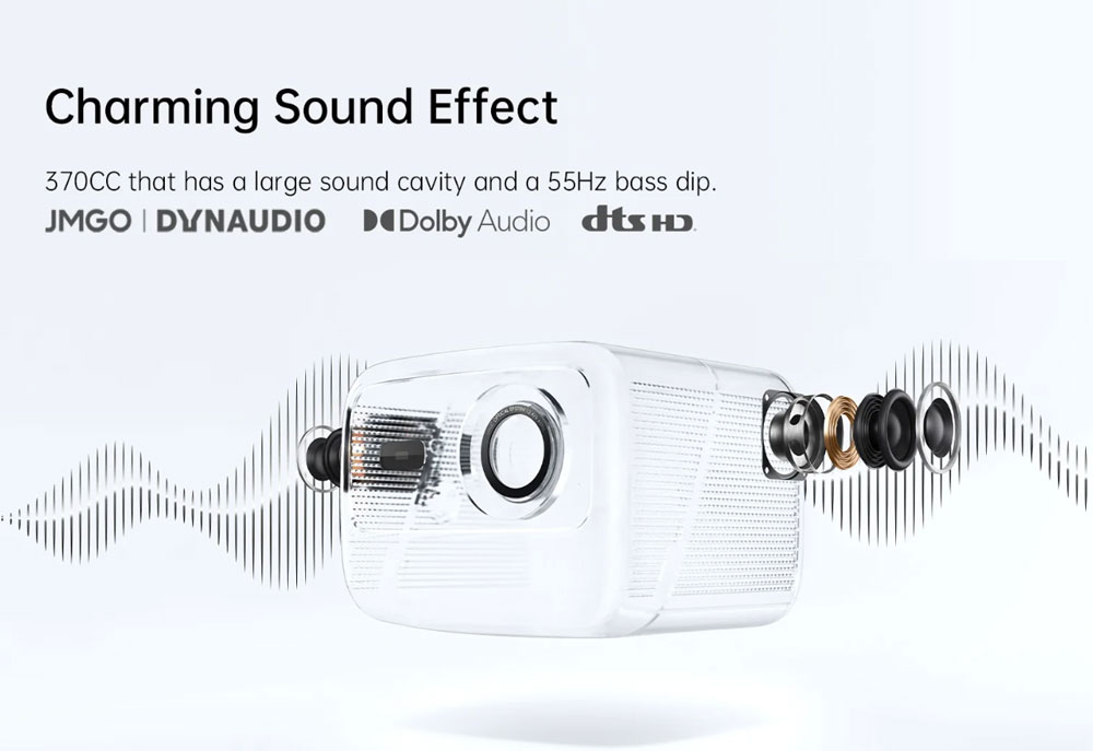 Không chỉ mạnh về hình ảnh, JMGO N1 còn sở hữu hệ thống âm thanh cao cấp do Dynaudio tinh chỉnh với hai loa công suất 5W. Âm thanh lan tỏa 360°, giàu chi tiết, hỗ trợ Dolby Audio và DTS, mang lại không gian xem phim sống động và chân thực mà không cần kết nối thêm loa ngoài.