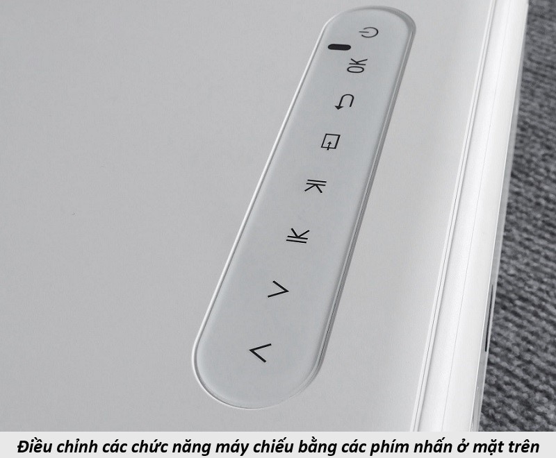 Mặt trước của máy chiếu được trang bị một thấu kính lớn với khả năng zoom rộng, mặt trên là các phím điều chỉnh, chức năng đặc biệt tiện dụng. Trong khi đó, mặt bên là các cổng ngõ để bạn tiện kết nối với các thiết bị, hỗ trợ trình chiếu đơn giản, dễ dàng.