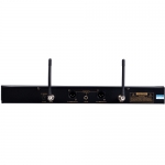 Mặt sau của đầu thu là các cổng kết nối với 2 cổng jack XLR kết nối riêng biệt cho từng kênh micro đến mixer và 1 cổng jack 6.3mm dùng chung thông dụng kết nối với vang số hoặc ampli karaoke. Trang bị 2 ăngten giúp đôi micro bắt sóng khi ở xa hơn với phạm vi hoạt động lên tới 100m - một điều kiện hoàn toàn lý tưởng để trải nghiệm âm thanh tuyệt vời.