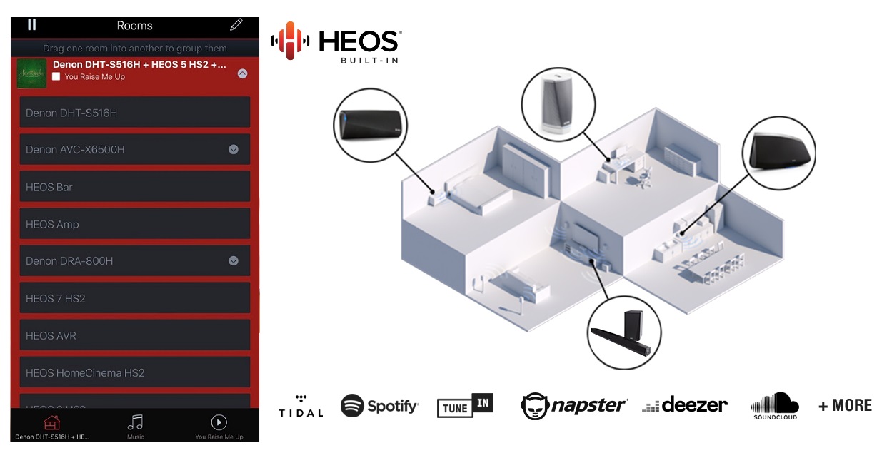 Denon DHT-S516H được tích hợp nền tảng streaming phiên bản mới nhất, người dùng có thể điều khiển từ xa dễ dàng qua ứng dụng HEOS (Android/iOS). Soundbar sẽ nhận phát nhạc từ các trang mạng trực tuyến như Spotify, TuneIn, SoundCloud, TIDAL, Deezer…như 1 máy tính chơi nhạc Online.