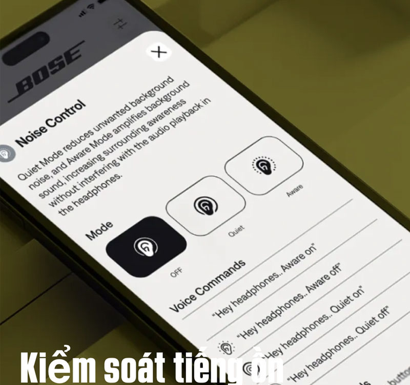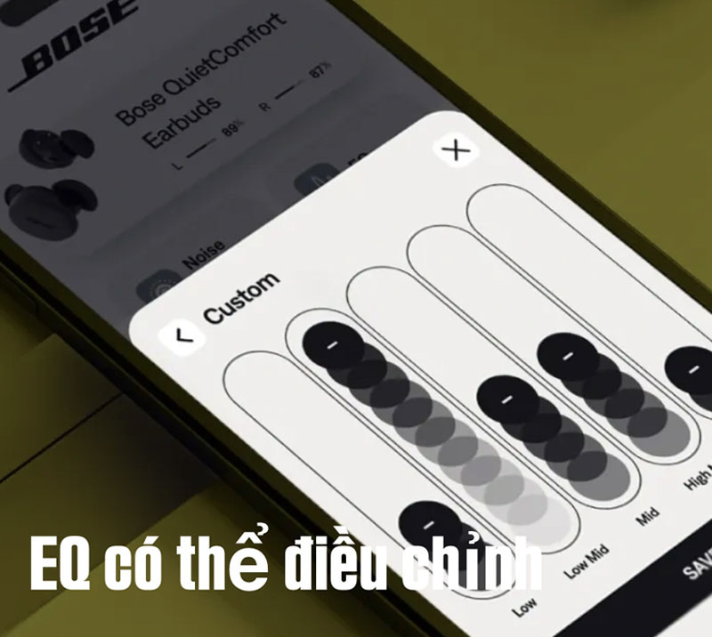 Người dùng có thể tuỳ chỉnh âm thanh trực tiếp thông qua ứng dụng Bose QCE với EQ năm băng tần. Điều này cho phép bạn dễ dàng điều chỉnh âm trầm, âm trung và âm bổng để phù hợp với gu nghe nhạc của mình. Bên cạnh đó, tai nghe cũng có tính năng kiểm soát tiếng ồn, cho phép chuyển đổi giữa các chế độ chống ồn chủ động hoặc chế độ nhận biết môi trường xung quanh để phù hợp với từng hoàn cảnh. Điều khiển cảm ứng thông minh tích hợp giúp bạn thao tác dễ dàng mà không cần phải sử dụng trực tiếp trên thiết bị.