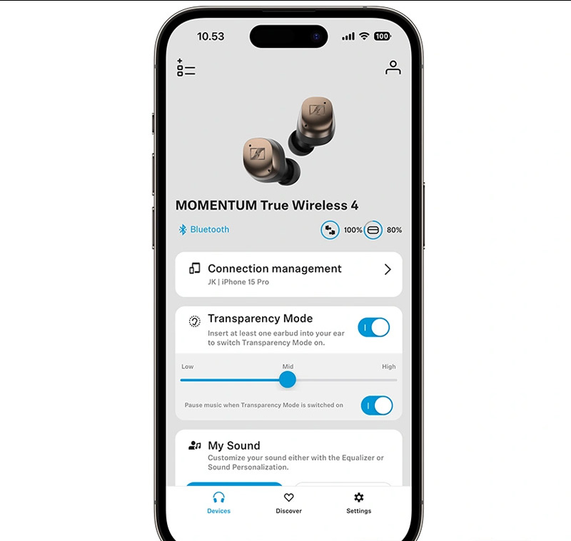 Không chỉ có vậy, tai nghe Sennheiser Momentum True Wireless 4 còn tương thích với ứng dụng Sennheiser Smart Control dành cho cả thiết bị iOS và Android, tương tự như ở các model được giới thiệu trước đó. Ứng dụng này nhằm cung cấp cho người dùng khả năng điều chỉnh EQ và tính năng cá nhân hóa âm thanh (Sound Personalization) theo sở thích của mỗi người.