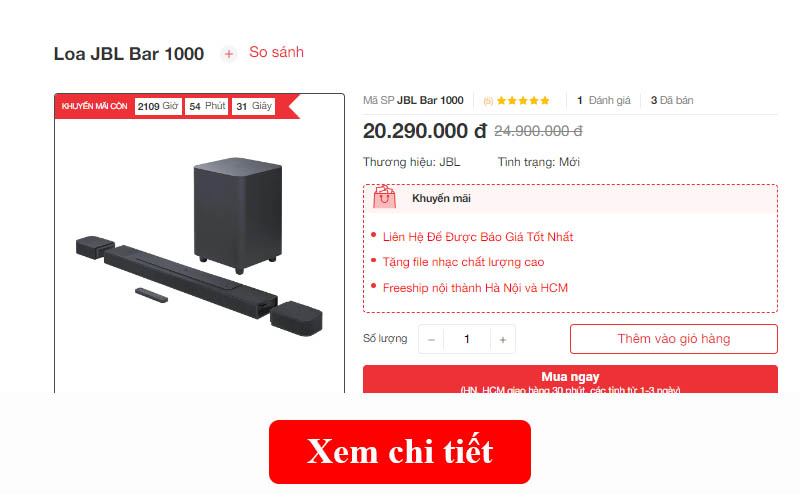 Loa JBL Bar 1000 là hệ thống âm thanh cao cấp được thiết kế để mang lại trải nghiệm âm thanh tối ưu cho người dùng. Với công nghệ Dolby Atmos và DTS:X, JBL Bar 1000 tạo ra âm thanh vòm 3D sống động và chân thực, giúp bạn đắm chìm trong từng cảnh phim hay giai điệu âm nhạc. Hệ thống bao gồm một loa thanh mạnh mẽ và loa trầm không dây, cùng với các loa vệ tinh có thể tháo rời, mang lại công suất tổng cộng lên đến 880W. Thiết kế thanh lịch và hiện đại của JBL Bar 1000 không chỉ tăng thêm vẻ đẹp cho không gian sống mà còn dễ dàng kết nối với các thiết bị khác qua Bluetooth hoặc Wi-Fi, đảm bảo sự tiện lợi và linh hoạt trong sử dụng.