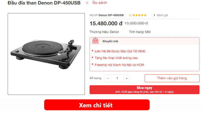 Đầu đĩa than Denon DP-450USB là thiết bị cao cấp dành cho người yêu nhạc analog, kết hợp giữa chất lượng âm thanh xuất sắc và tính năng kỹ thuật số tiện lợi. Với hệ thống truyền động dây curoa, kim MM cao cấp và hỗ trợ ba tốc độ quay (33 1/3, 45, và 78 RPM), DP-450USB mang lại âm thanh trung thực và mượt mà. Điểm nổi bật của thiết bị là khả năng chuyển đổi đĩa vinyl sang định dạng kỹ thuật số qua cổng USB, giúp lưu trữ và chia sẻ nhạc dễ dàng. Thiết kế chắc chắn với tính năng tự động dừng và nâng tay cần sau khi hết đĩa, cùng tích hợp sẵn preamp phono, làm cho DP-450USB trở thành lựa chọn lý tưởng cho những ai muốn trải nghiệm và lưu giữ âm nhạc analog.