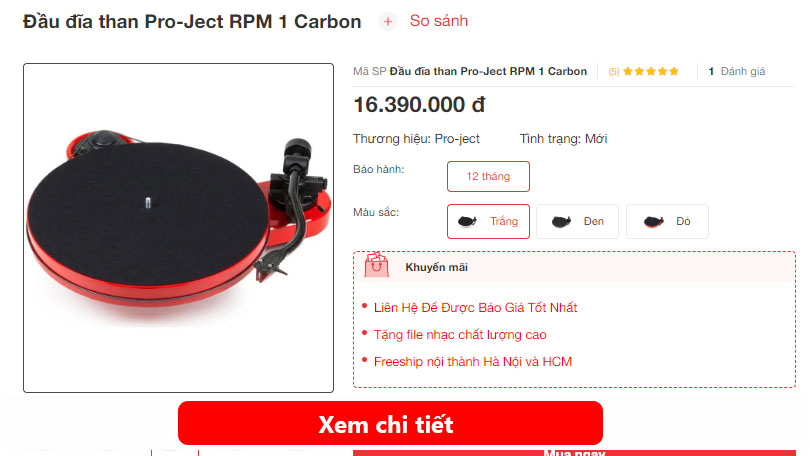 Đầu đĩa than Pro-Ject RPM 1 Carbon là một thiết bị cao cấp dành cho những người đam mê âm nhạc analog, nổi bật với thiết kế hiện đại và chất lượng âm thanh vượt trội. Được chế tạo từ vật liệu sợi carbon và các thành phần cao cấp, đầu đĩa này mang lại độ bền và hiệu suất cao. Hệ thống truyền động bằng dây curoa và kim MM (Moving Magnet) cao cấp đảm bảo âm thanh trung thực và mượt mà. Với tốc độ quay 33 1/3 và 45 RPM, RPM 1 Carbon phù hợp với hầu hết các loại đĩa vinyl. Thiết kế không khung, kết hợp với chân đế giảm rung chấn, giúp giảm thiểu độ rung và cải thiện chất lượng âm thanh tổng thể. Pro-Ject RPM 1 Carbon là sự kết hợp hoàn hảo giữa thẩm mỹ và hiệu suất, lý tưởng cho những ai muốn trải nghiệm âm nhạc analog ở đẳng cấp cao nhất.